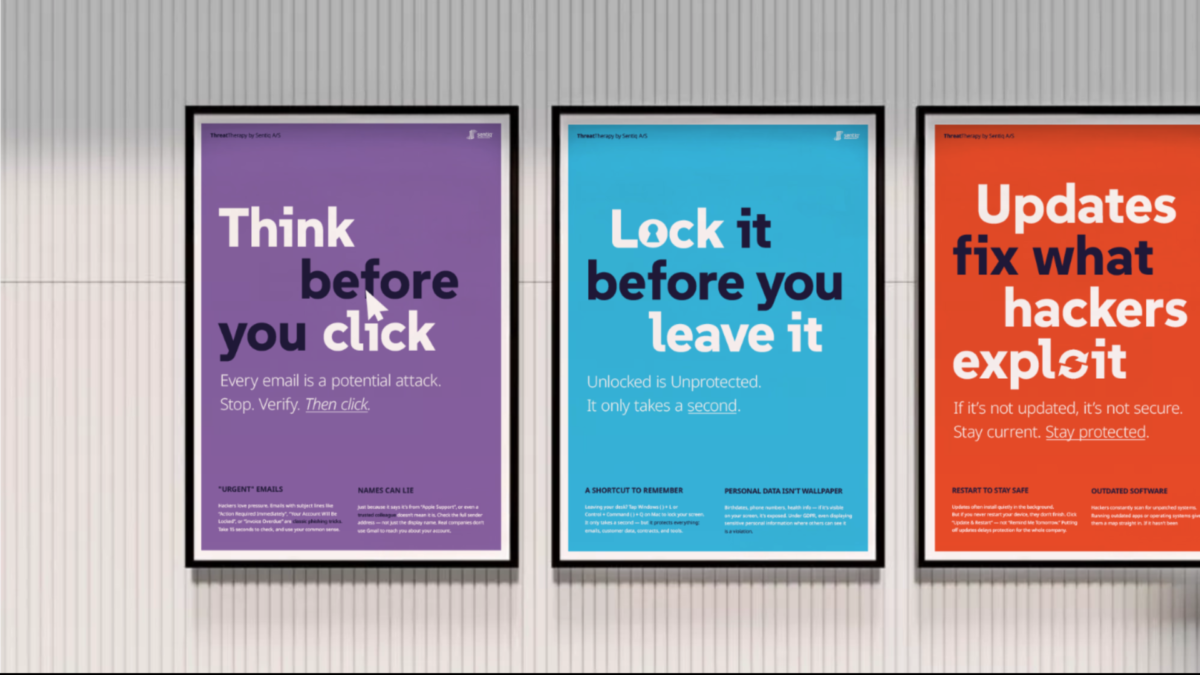 Tre plakater, der understøtter jeres næste awareness-kampagne og hjælper medarbejdere med at huske de vigtigste sikkerhedsprincipper i hverdagen.